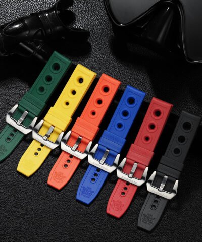 • FKM RUBBER IN MATTE FINISHThese straps are made with FKM fluoroelastomer, which is widely considered to be the second to none when used as a material for watch straps. It has high chemical stability, and is resistant to aging and weather. Most importantly, it doesn’t attract dust!